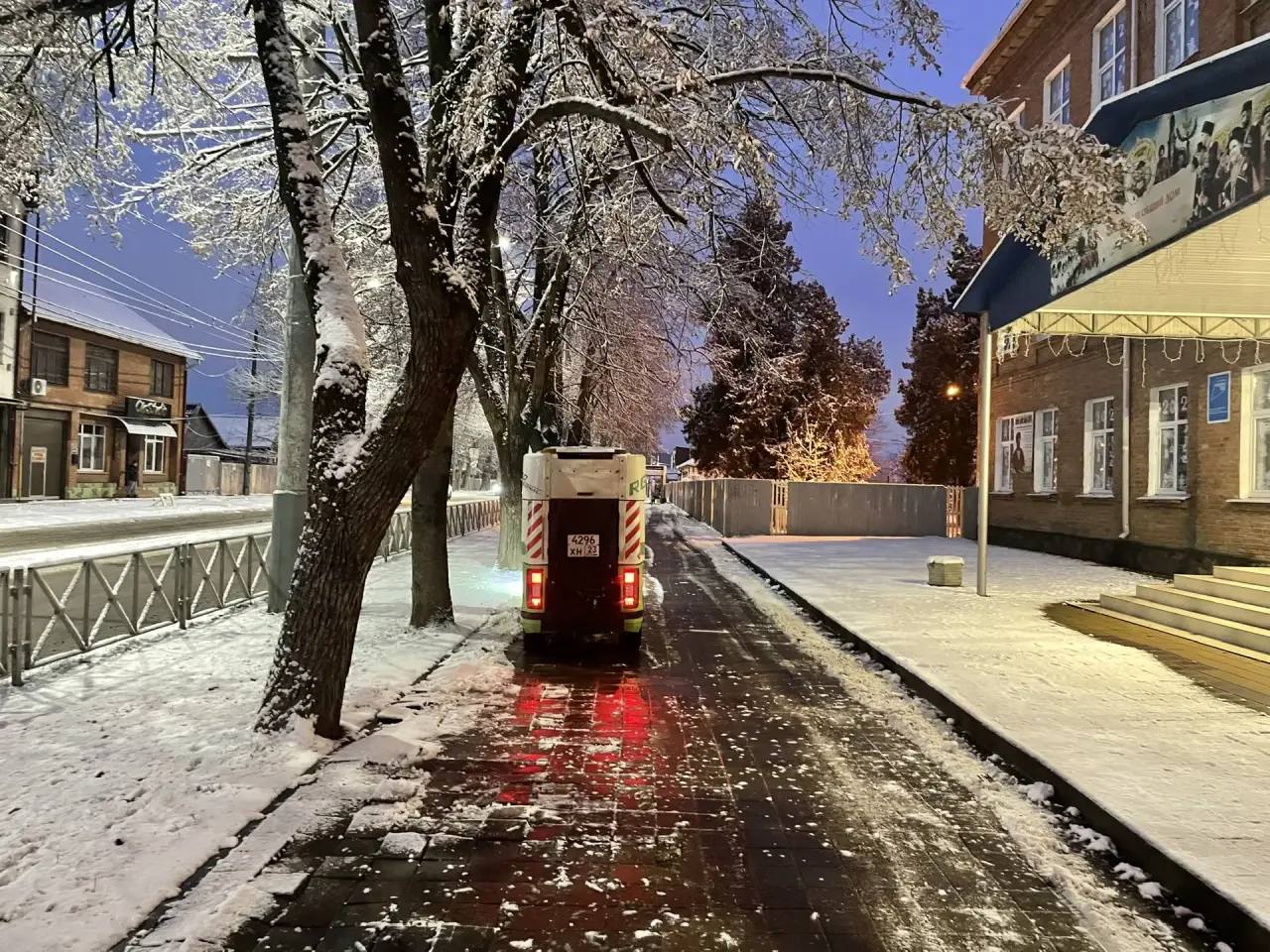 Первый большой снег выпал в Краснодаре. Тротуары и дороги очищают и обрабатывают от гололёда