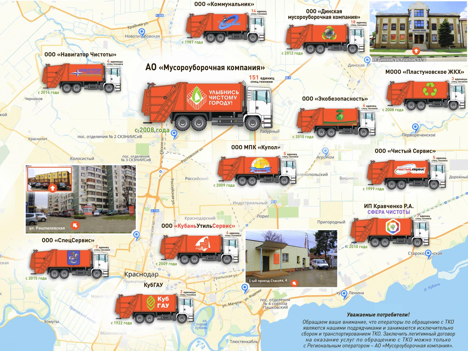 Главный офис компании находится на ул. Рашпилевской, 325. Два ведущих офиса расположены в Краснодаре по ул. Стасова 1-й проезд, д. 4 и в ст. Динской по ул. Красной, д. 53/1. Для удобства наших клиентов в МО г. Краснодар и Динской район работают еще 13 дополнительных филиалов, актуальные адреса, режим работы и контактную информацию о которых Вы всегда найдете на нашем сайте www.trashcomp.com.