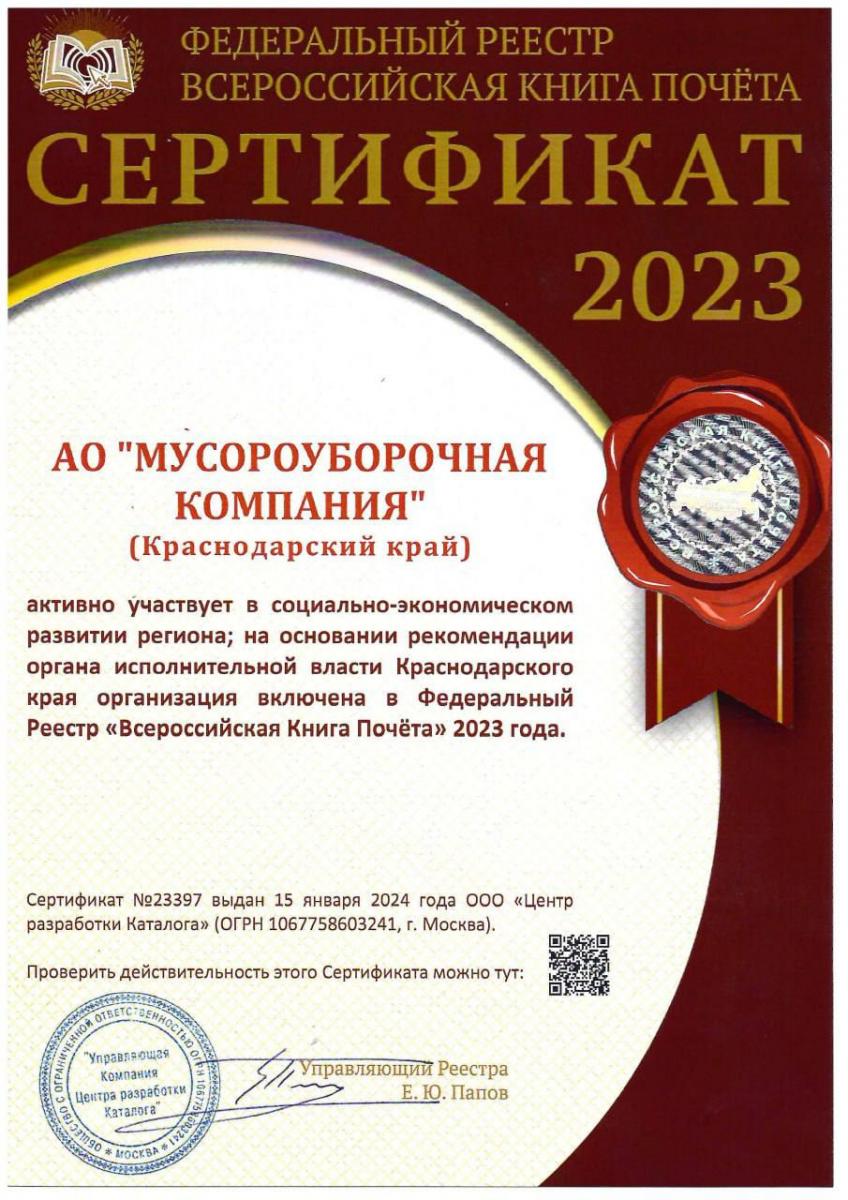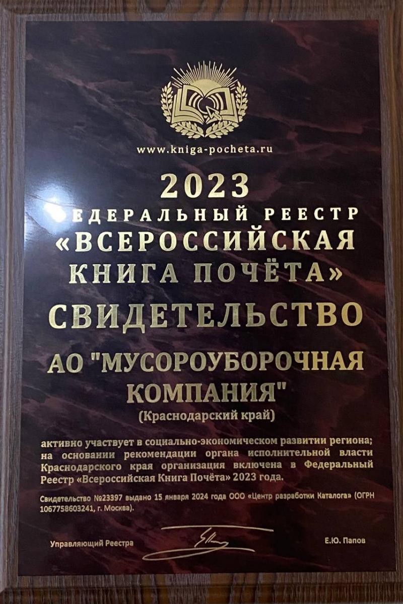 АО "Мусороуборочная компания" внесена в Федеральный реестр "Всероссийской книги почета"