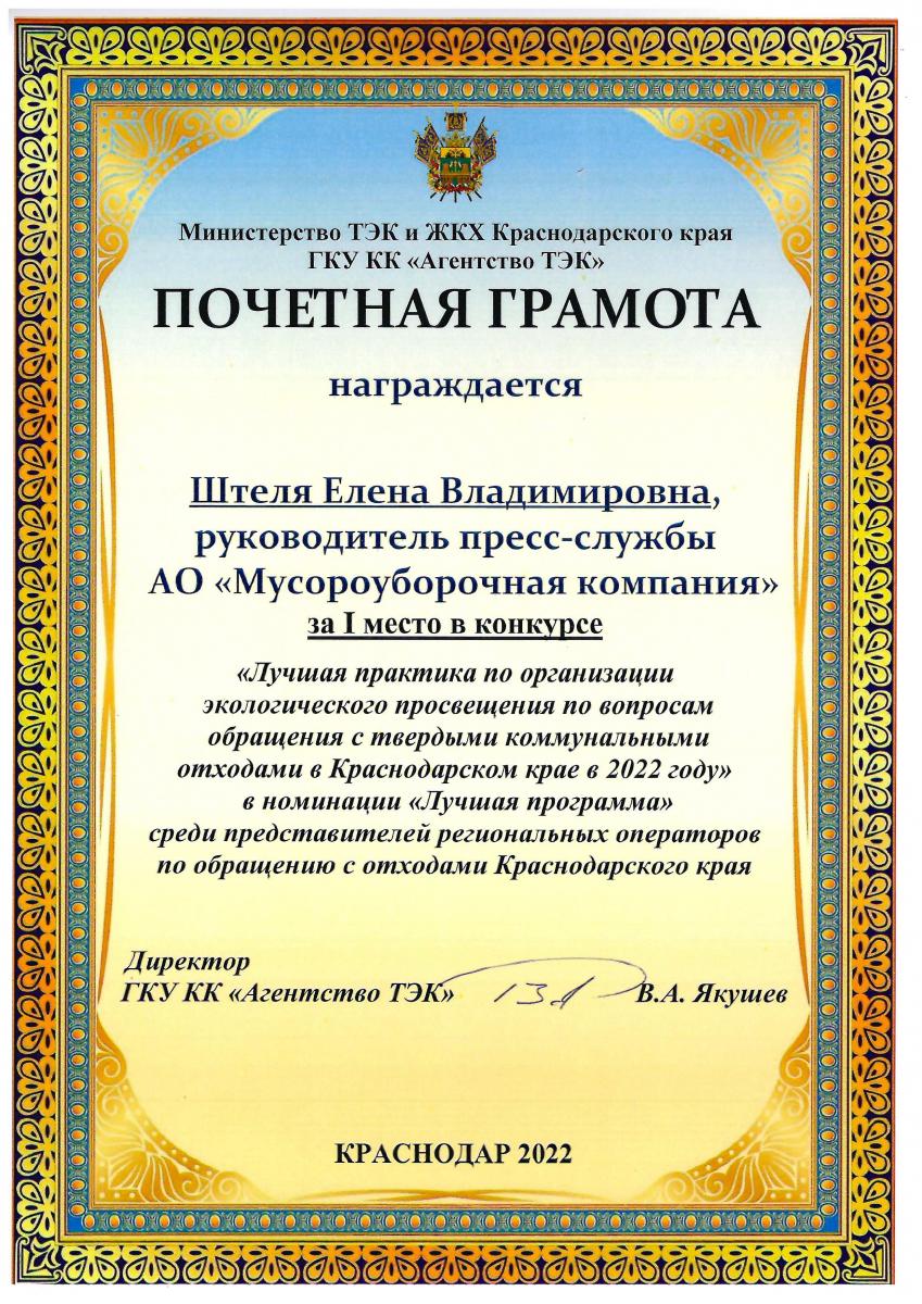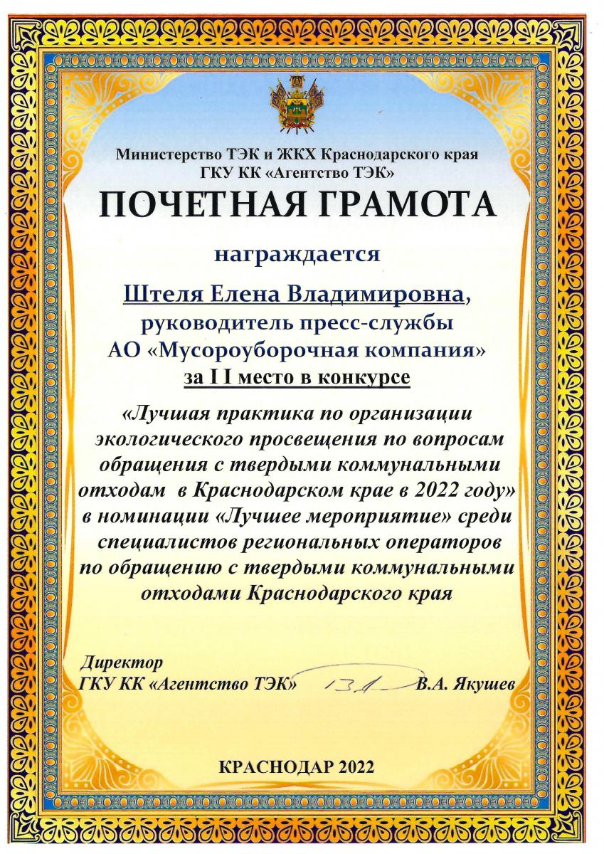 Проекты программы внедрения экологической грамотности регионального оператора заняли призовые места в конкурсе на лучшую практику по организации экологического просвещения по вопросам обращения с ТКО в Краснодарском крае в 2022 году, проводимом ГКУ КК «Агентство ТЭК». В номинации «Лучшая программа» образовательный проект «Это всем легко понять – мусор нужно разделять» занял в первое место среди представителей региональных операторов по обращению с ТКО в Краснодарском крае, а в номинации «Лучшее мероприятие» конкурс «Картинки из мусорной корзинки» получил второе место.
