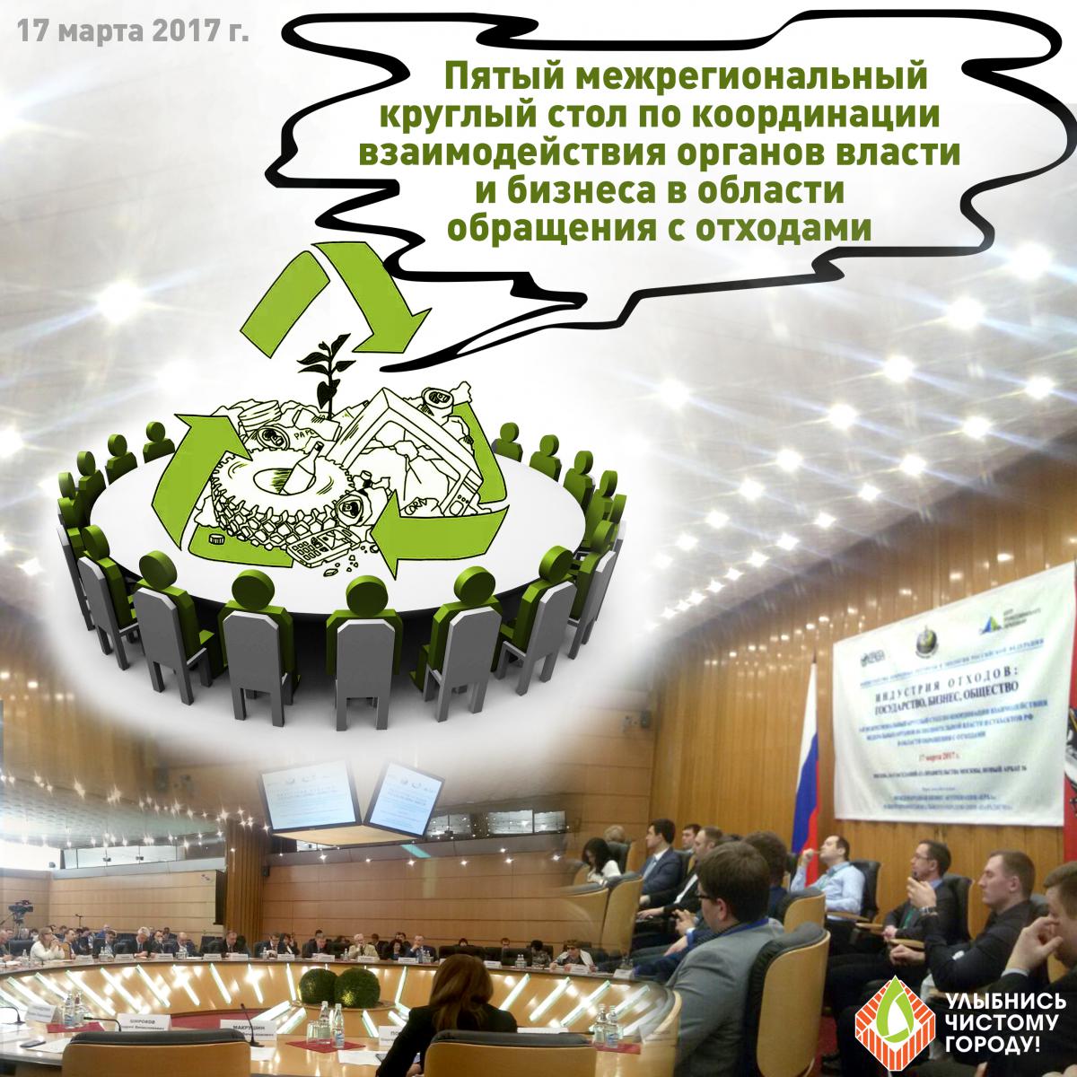 Пятый круглый стол прошел 17 марта 2017 г. На мероприятии были освещены вопросы исполнения поручений Президента Российской Федерации по итогам заседания Государственного совета по вопросу «Об экологическом развитии Российской Федерации в интересах будущих поколений», состоявшегося 27 декабря 2016 года, в части обращения с отходами; опыт и проблемы реализации ответственности производителей и создания государственного реестра объектов, оказывающих негативное воздействие на окружающую среду; создания новой системы обращения с твердыми коммунальными отходами.