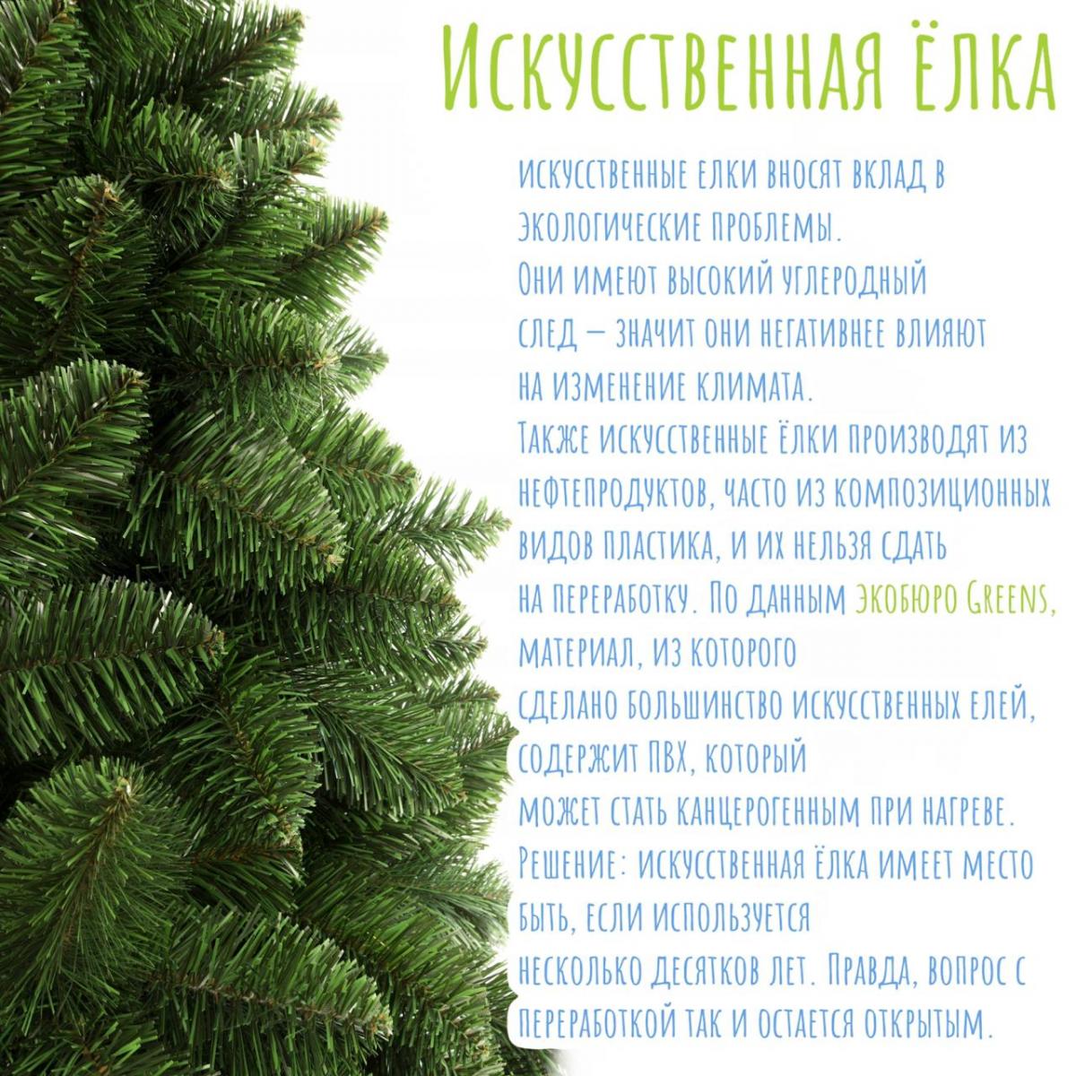 Проблема: искусственные елки вносят вклад в экологические проблемы. Они имеют высокий углеродный след — значит они негативнее влияют на изменение климата.