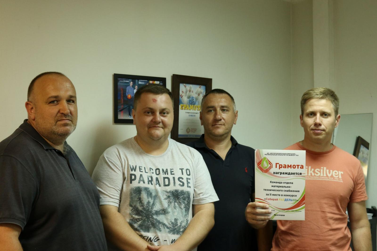 Победителями в нашем конкурсе стали: команда полигона депонирования ТКО, собравшая 150 кг пластика, команда отдела материально-технического снабжения, которая собрала 126 кг макулатуры и 4.5 кг пластика, и команда ремонтно-механической мастерской, собравшая 48.5 кг картона и 20.5 кг пластика. Команды заняли первое, второе и третье место соответственно.