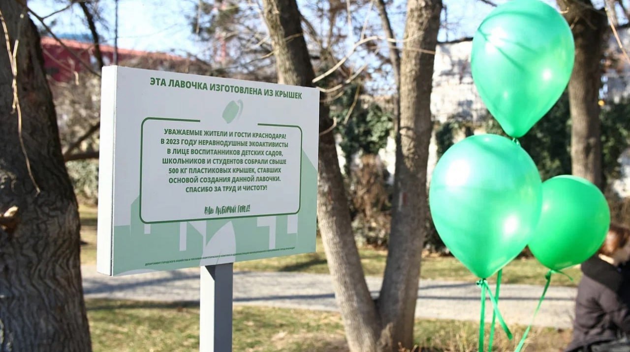 На изготовление первой эколавочки из переработанных крышек ушло 500 кг пластика.Крышки собрали жители Краснодара в прошлом году в рамках акции «Крышки на благо». В акции приняли участие школьники, студенты вузов и ссузов и воспитанники детсадов. Лавочку установили на бульваре Дальнем. Эколавочка отличается повышенными антивандальными, ударо- и пожаропрочными свойствами. Также акция "Крышки на благо" стала началом реализации нового городского проекта «ЭКО100лица». В его рамках в течение года пройдёт множество мероприятий. Цель — повышение экологической культуры краснодарцев, формирование бережного отношения к природе, рационального использования ресурсов, пропаганда безопасных способов природопользования.