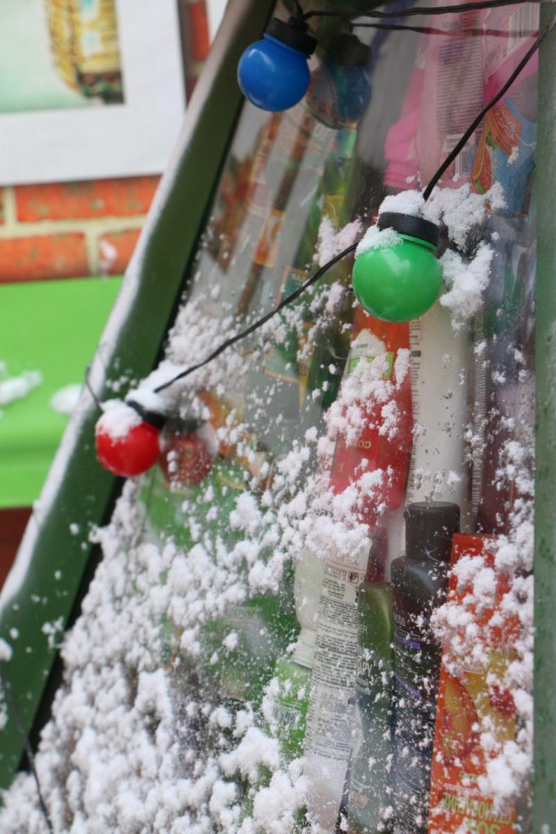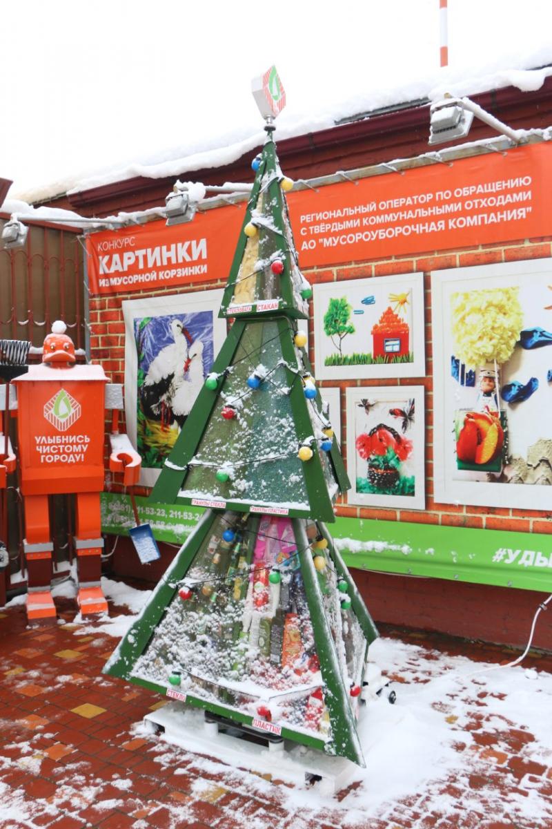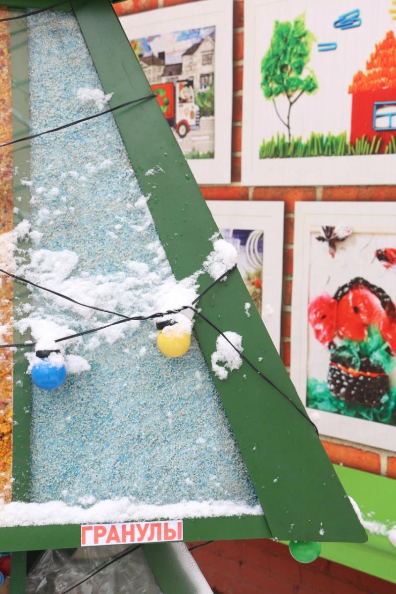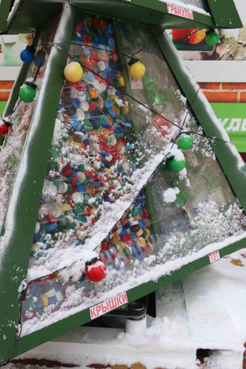 В основании елки мы видим отсеки с отсортированными пластиковыми бутылками, упаковками для бытовой химии, стеклом, жестяными банками, крышками и другой упаковкой. В середине – промежуточный результат после переработки. А "крона" экологического новогоднего дерева представляет собой готовую продукцию из вторичного сырья.