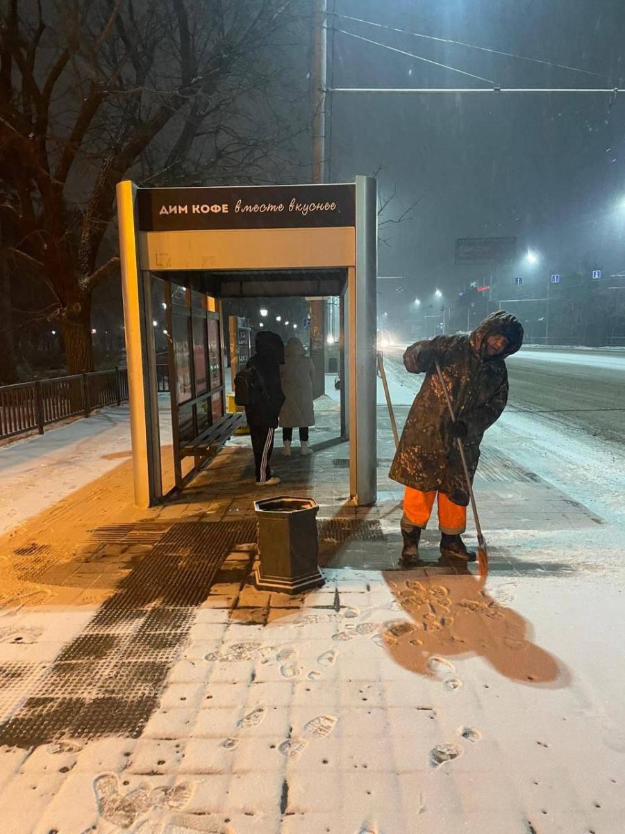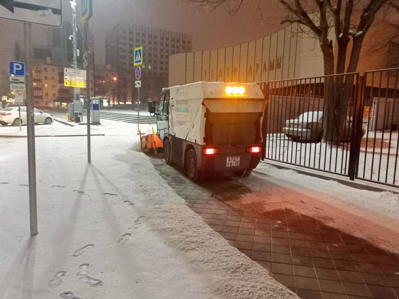 В 20:00 23 февраля 41 снегоуборочная машина вышла на дежурство. До утра от осадков были обработаны основные городские магистрали и путепроводы, для посыпки дорог потребовалось 448,5 тонны противогололёдного материала. С 06:00 началась расчистка тротуаров, остановок общественного транспорта, ступеней в подземных и надземных переходах песко-соляной смесью. На этих работах задействовано 557 человек и 21 единица техники.