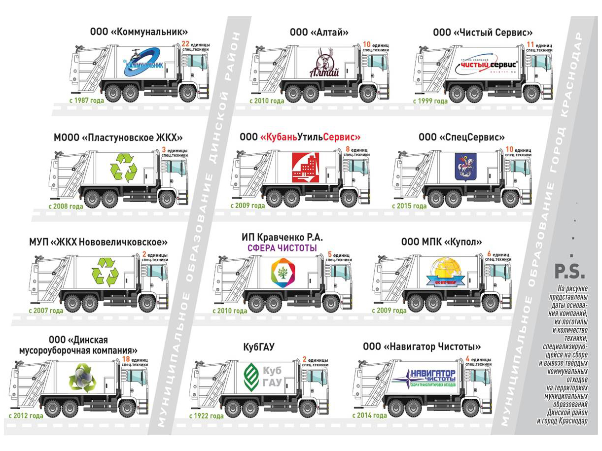 АО «Мусороуборочная компания» как региональный оператор по обращению с твердыми коммунальными отходами по Краснодарской зоне воспользовалось правом привлечения операторов. На сегодняшний день 8 операторов осуществляют деятельность по обращению с твердыми коммунальными отходами в МО г. Краснодар и 4 оператора – в МО Динской район.
