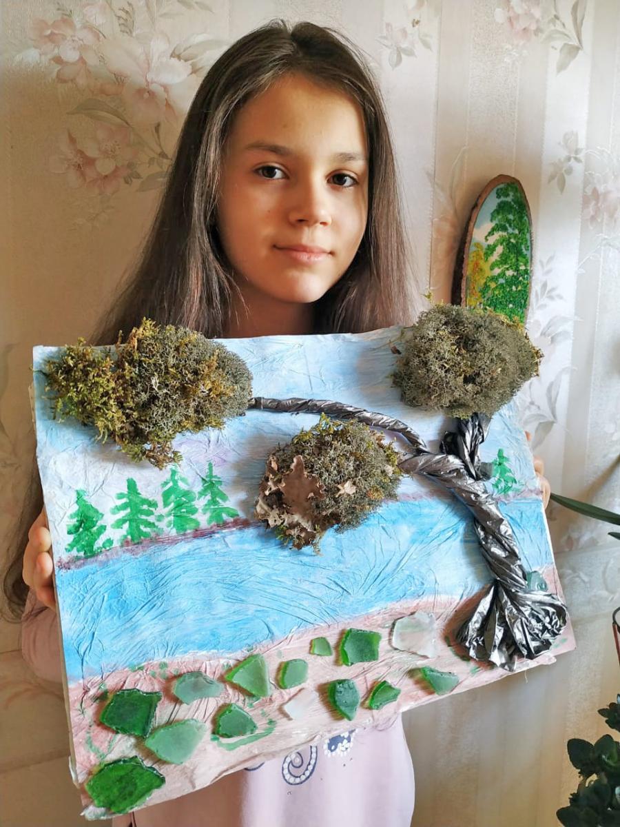 Встречайте панно «Пицунда» автор- Юрченко Руслана, 12 лет, номинация -«Разделяя, сочетай!». Картина названа в честь города Пицунда в Абхазии. Можем лишь предположить, что Руслана черпала вдохновение от поездки в этот чудесный город.