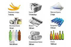 Каждый день на планете образуются тонны отходов, которые являются огромной проблемой современности. Промышленный и бытовой мусор не только наносит вред окружающей среде, но и несет угрозу для здоровья людей. Объемы потребления различной продукции человеком постоянно увеличиваются, что вызывает рост количества отходов. Период разложения отходов может колебаться от нескольких недель до сотен лет, что впоследствии приведет к отчуждению огромных территорий под места их захоронения. Понимая всю остроту данной проблемы, еще в самом начале 80-х годов прошлого века в некоторых странах уже широко применялась практика раздельного сбора мусора, который образуется в процессе жизнедеятельности человека. Отсортированные отходы обезвреживаются и утилизируются специальным образом, что позволяет значительно снизить их накопление в окружающей среде. Ниже приведены сроки разложения некоторых видов отходов по возрастанию.