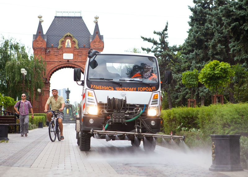 Механическая уборка подразумевает и сметание грязи, и мойку улиц. Машины по маршрутам распределяются исходя из их возможностей. Так, например, «Бродвей» - огромная машина с прицепом, достигающая 12 метров в длину, рассчитана на большой объем и потому выходит на длинные и широкие магистральные улицы - Уральскую, Ставропольскую.
