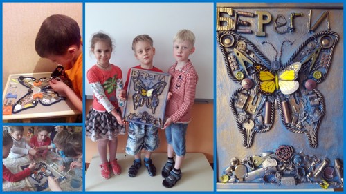 В рамках объявленного в 2017 году «Года экологии», воспитанники группы №12 совместно с педагогом Димидовой Александрой Эдуардовной приняли участие в конкурсе «Картинки из мусорной корзинки», организованном ОАО «Мусороуборочная компания». Целью конкурса стало привлечение внимания к проблеме загрязнения окружающей среды и повышения экологической культуры жителей нашего города. На первом этапе ребята собрали и принесли из дома все то, что должно было оказаться в мусорной корзине: поломанные игрушки, старые гайки и болты, шнуры, пуговицы и прочее. Все вместе обсудили, а можно ли всё это не выбрасывать, а попытаться дать ему «вторую жизнь».Дети предложили создать картину, придумали композицию, обозначили её контур в виде бабочки и приступили к воплощению идеи: приклеили «мусор» внутри контура. В результате получилась бабочка, летящая над планетой.